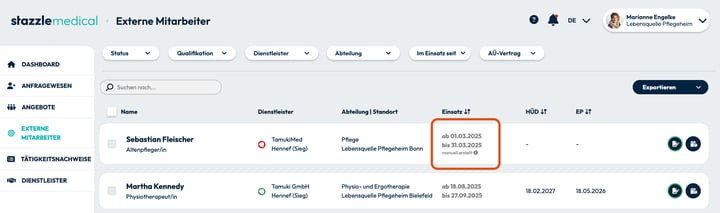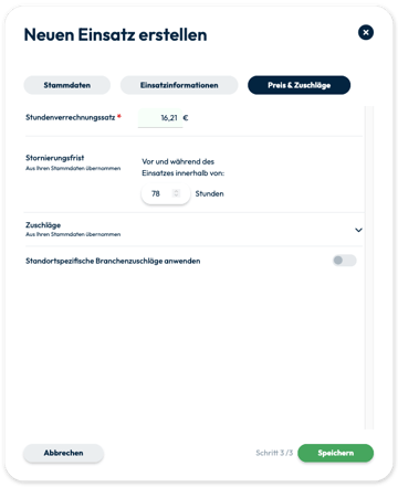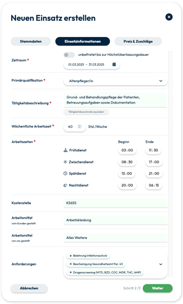 In diesem Schritt füllen Sie die Einsatzdetails aus, wie der Zeitraum und die gebuchte Qualifikation. Diese Daten werden in der Regel vom Kundenstandort bei der Anfrageerstellung ausgefüllt. Alle vorgefüllten Daten (Tätigkeitsbeschreibung eingeschlossen) basieren auf den Daten des Kundenstandortes bzw. der Abteilung.