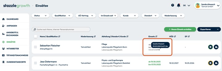 Die manuell erstellten Einsätze werden mit einem grauen Text “manuell erstellt” unter dem Zeitraum markiert. In einem Tooltip steht die Information wer, wann diesen Einsatz erstellt hat.