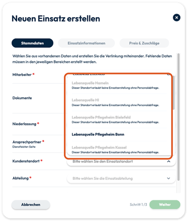 Beim Anwählen des Feldes “Kundenstandorte” in Schritt 1 werden Sie ausgegraute Standorte mit dem Hinweistext “Dieser Standort erlaubt keine Einsatzerstellung ohne Personalabfrage.” sehen. Dies bedeutet, dass der jeweilige Standort der Einsatzerstellung ohne vorausgehende Personalanfrage in den Standorteinstellungen nicht zugestimmt hat.